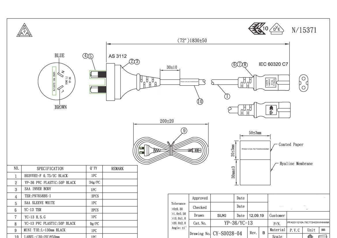 This molded AS 3112 to C7 International Power Cord is compatible with Australian plugs. It can be used with servers, CPUs, and other standard C7 power connector devices. It is made with high quality material and tested for dielectric voltage-withstand, polarization, and continuity to assure reliability and long-lasting performance. The power cord is manufactured in compliance with AS 3112 standards and is SAA certified. All international power cords hold the International Color Code (ICC) on the inner conductors of brown, blue, and green with a yellow stripe.