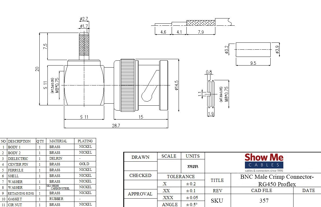 This 50 ohm BNC crimp connector is a locking RF connector that is used on many types of coaxial cable. BNC connectors are commonly used on test equipment, avionics, analog and serial digital interfaces as well as video signals. BNC crimp connector require a crimp tool for termination.