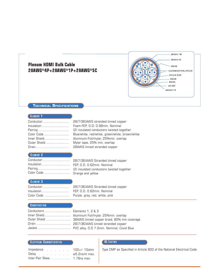 This Bulk HDMI Plenum rated cable is used to terminate HDMI assemblies quickly and easily in the field in plenum air-spaces. It allows installers in both commercial and residential areas to use HD signals without converting the whole system. This HDMI cable can support up to 1080p at 12 meters or up to 20 meters with an HDMI extender. It is designed to work with our HDMI field terminated connectors. Used in conjunction with our HDMI Crimp Tool, this special cable makes HDMI quick and easy to install in any location.