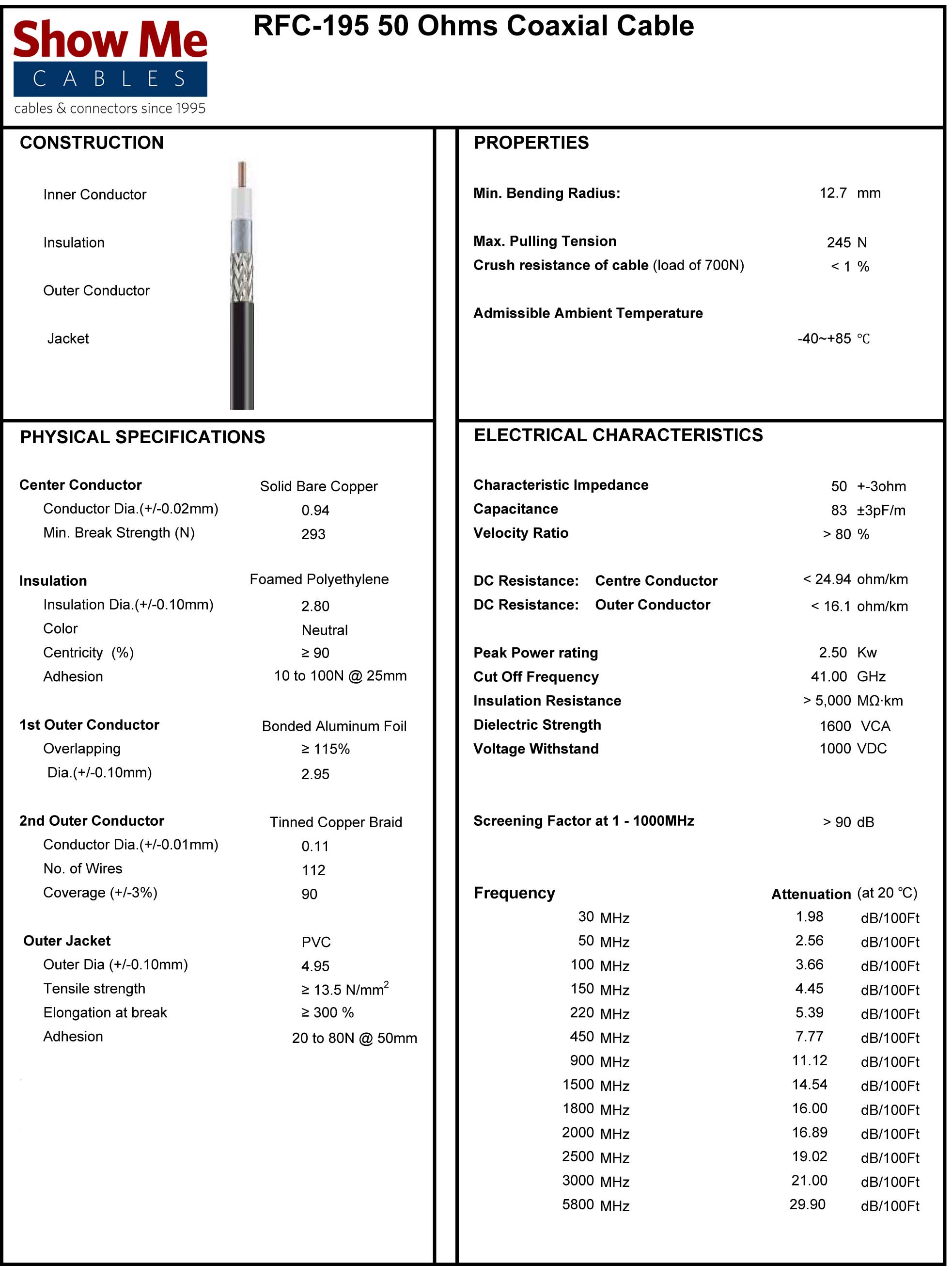 Low Loss 195 is designed to deliver high performance with minimal loss. Low Loss 195 is a comparable to LMR-195 and high quality alternative to RG-58. For example at 2.4 GHz, 100 feet of RG-58 would have 28.2dB of signal loss versus only 18.6dB of signal loss with low loss 195. With a durable Polyethylene jacket, these cables are suited for indoor and outdoor installations. Low loss 195 is light and flexible. The Low Loss 195 cable is acceptable for Wi-Fi, Antenna Cables, Ham Radio, Patch Cables, Jumper Cables, and shorter antenna cable runs.