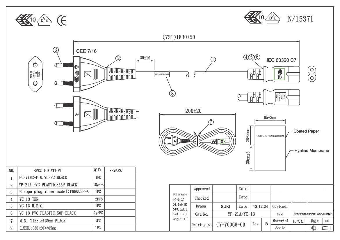 This molded Schuko CEE7/16 to C7 International Power Cord is compatible with plugs in several countries including Switzerland, Denmark, Italy, Argentina, Chine, Europe, and Russia. It can be used with servers, CPUs, and other standard C7 power connector devices. It is made with high quality material and tested for dielectric voltage-withstand, polarization, and continuity to assure reliability and long-lasting performance. The power cord is manufactured in compliance with CEE7/16 standards and is VDE certified. All international power cords hold the International Color Code (ICC) on the inner conductors of brown, blue, and green with a yellow stripe.Features: