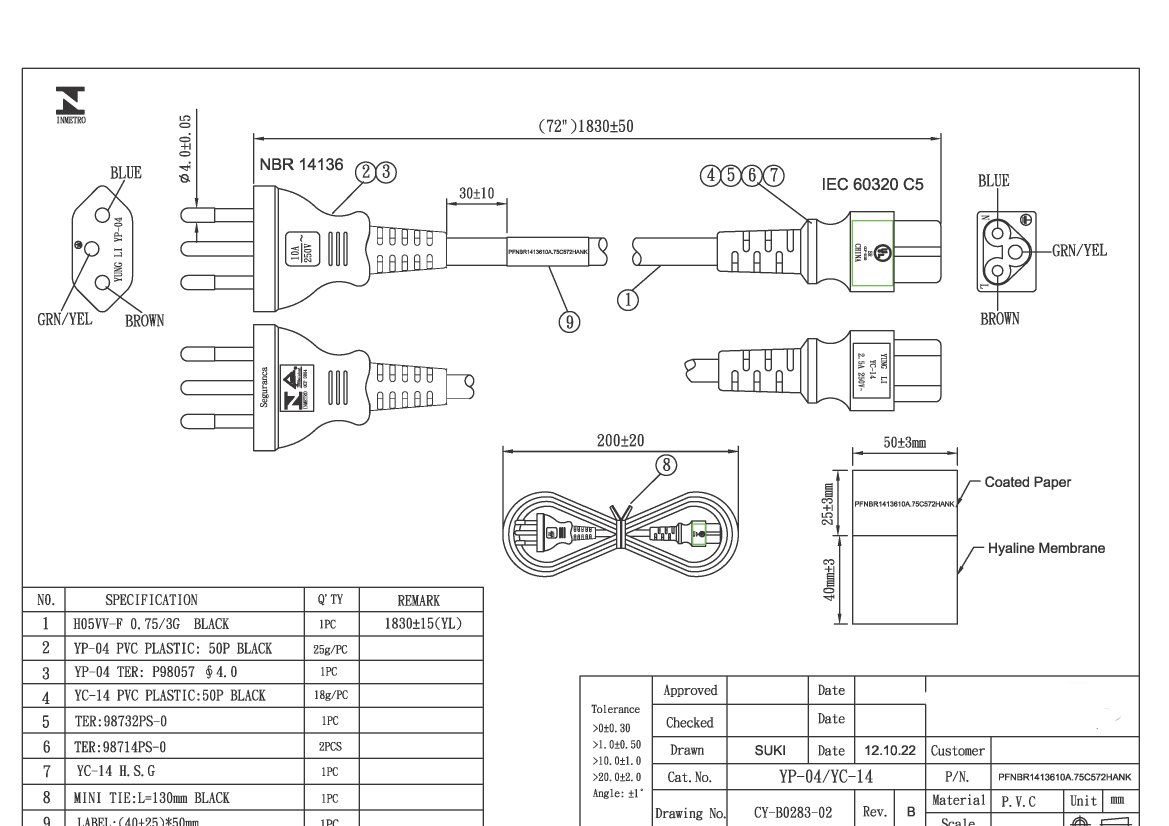 This molded NBR14136 to C5 International Power Cord is compatible with Brazillian plugs. It can be used with servers, CPUs, and other standard C5 power connector devices. It is made with high quality material and tested for dielectric voltage-withstand, polarization, and continuity to assure reliability and long-lasting performance. The power cord is manufactured in compliance with NBR 14136 standards and is InMetro certified. All international power cords hold the International Color Code (ICC) on the inner conductors of brown, blue, and green with a yellow stripe.