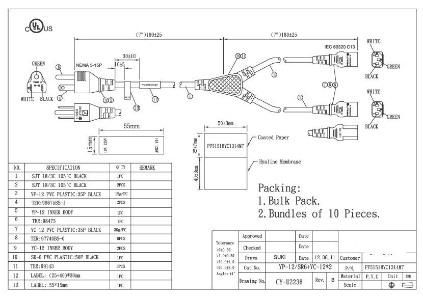 NEMA 5-15 to C13 Splitter Power Cord - 10 Amp - 18 AWG