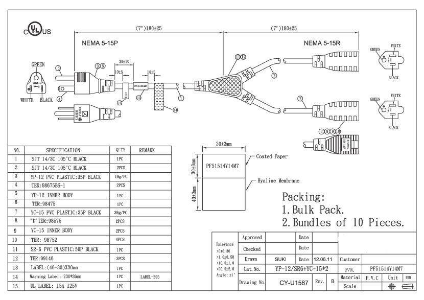 NEMA 5-15 to NEMA 5-15 Splitter Power Cord - 15 Amp