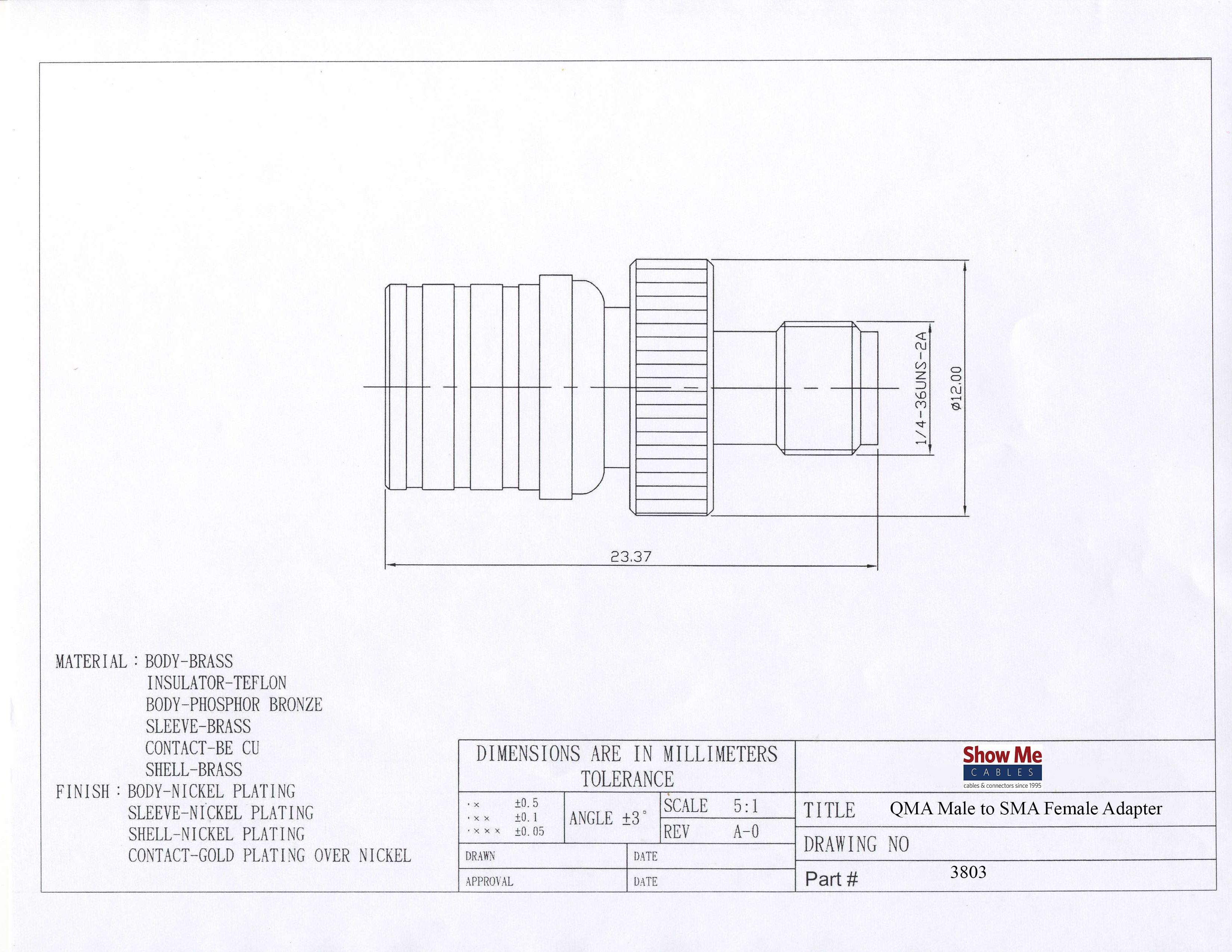 This nickel-plated coaxial adapter has an SMA female connector opposite a QMA male connector.