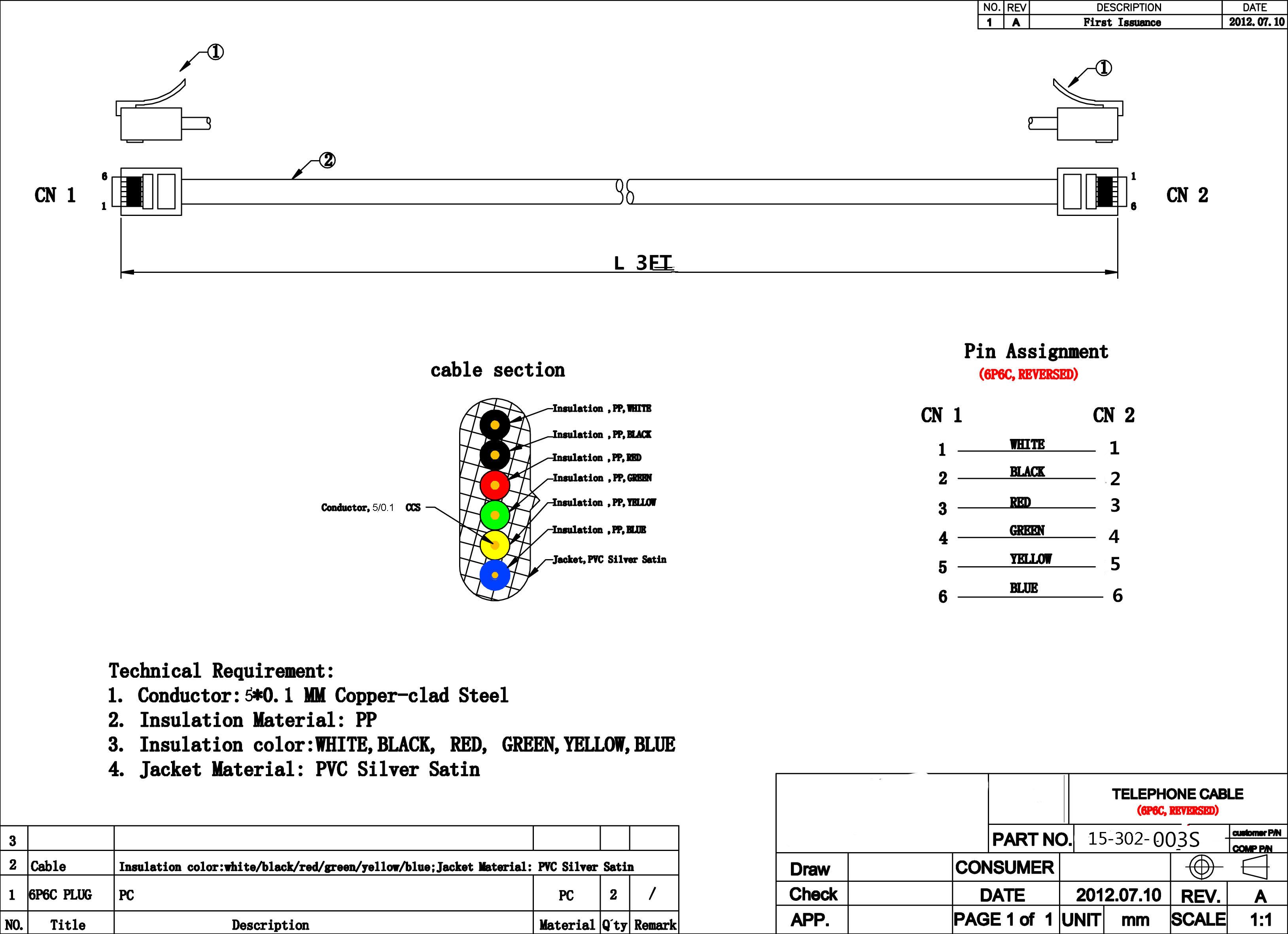 A straight pinned telephone line cord is commonly used for patching between patch panels or data communications equipment. This line cord consists of 6 conductors with a PVC jacket and modular RJ12 connectors at each end. Each conductor is stranded making the cable flexible and easily manageable.