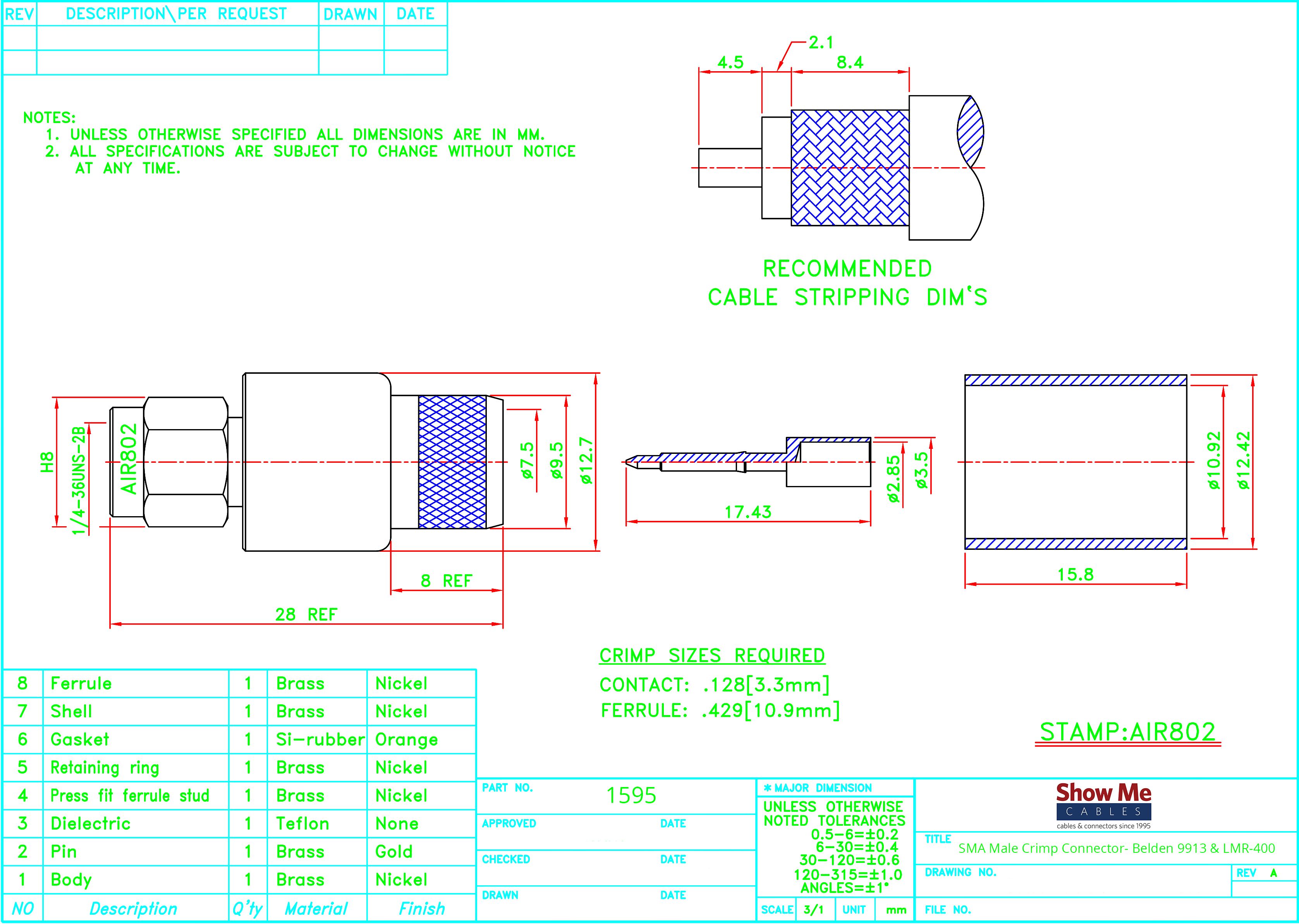 An SMA connector is a sub-miniature caoxial connector used in RF applications. SMA connectors are threaded for a secure connection. All SMA connectors are 50 Ohm connectors and come in male and female variations, as well as reverse polarity.