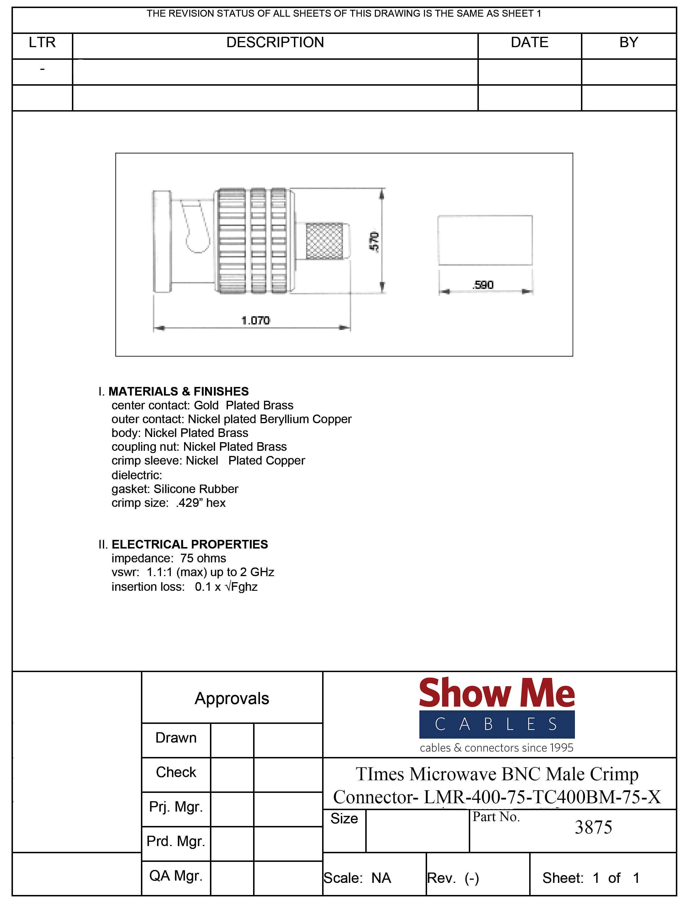 This 75 ohm BNC crimp connector is a locking RF connector that is used on many types of coaxial cable. BNC connectors are commonly used on test equipment, avionics, analog and serial digital interfaces as well as video signals. BNC crimp connectors require a crimp tool for termination.